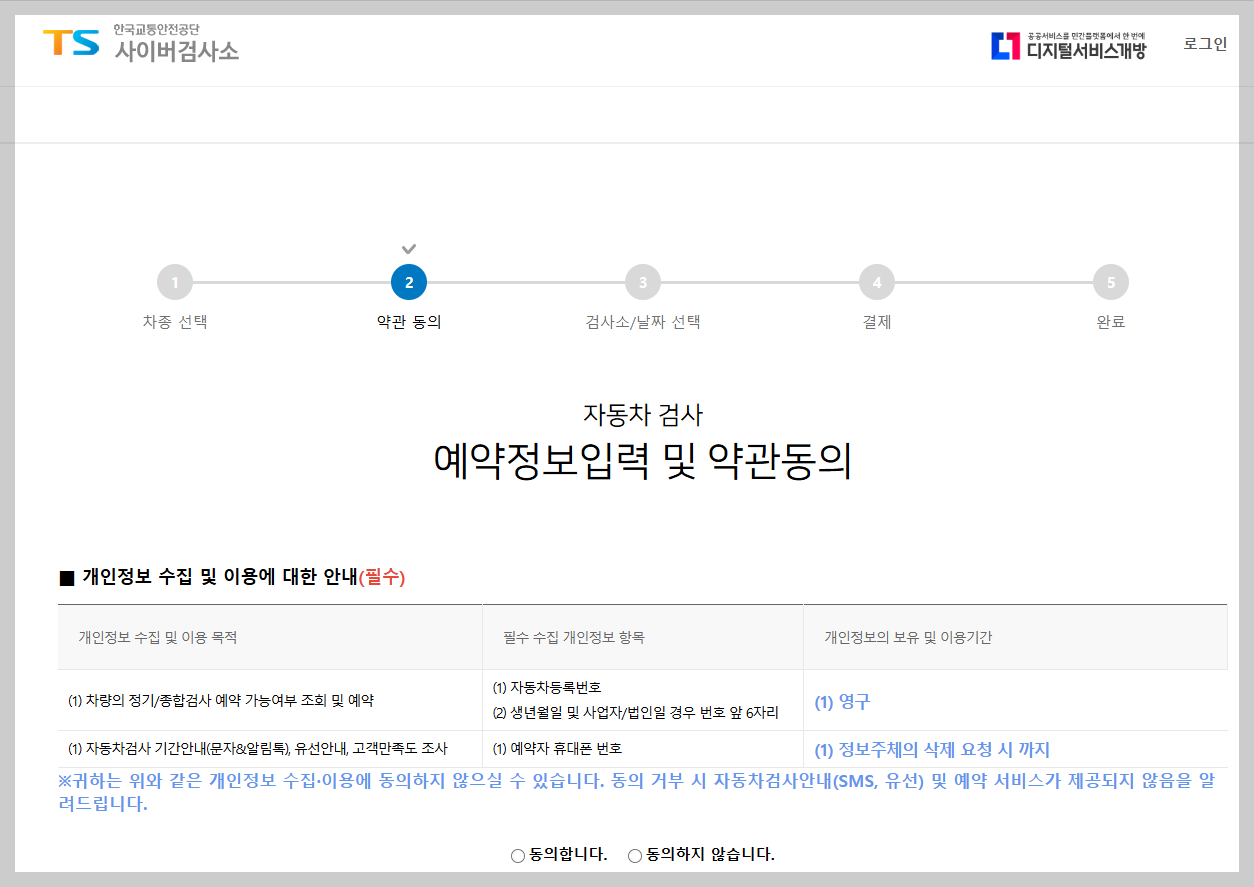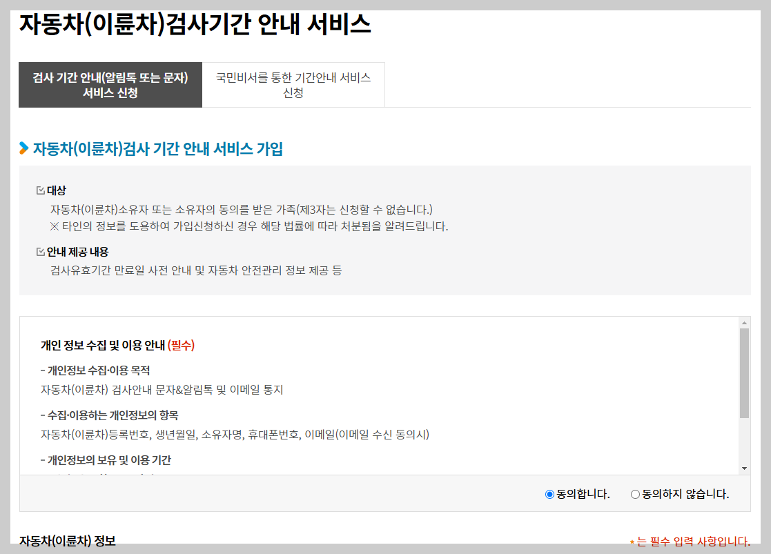 - 자동차검사 예약 항목 선택 후 차량 정보 입력