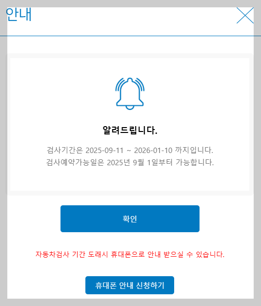 검사기간의 대한 안내와 함께 휴대폰으로 안내 신청하기 버튼이 있으니 신청하시기 바랍니다.