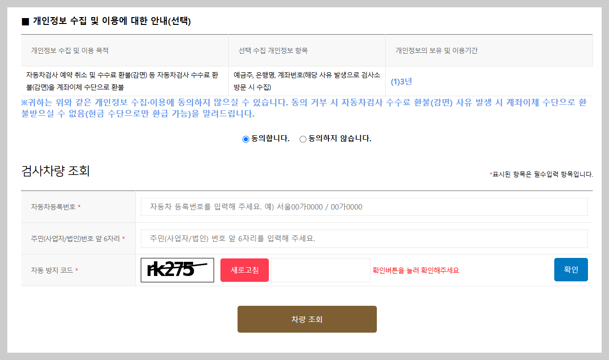 - 차량 등록번호와 주민등록번호 앞 6자리를 입력 후 조회
