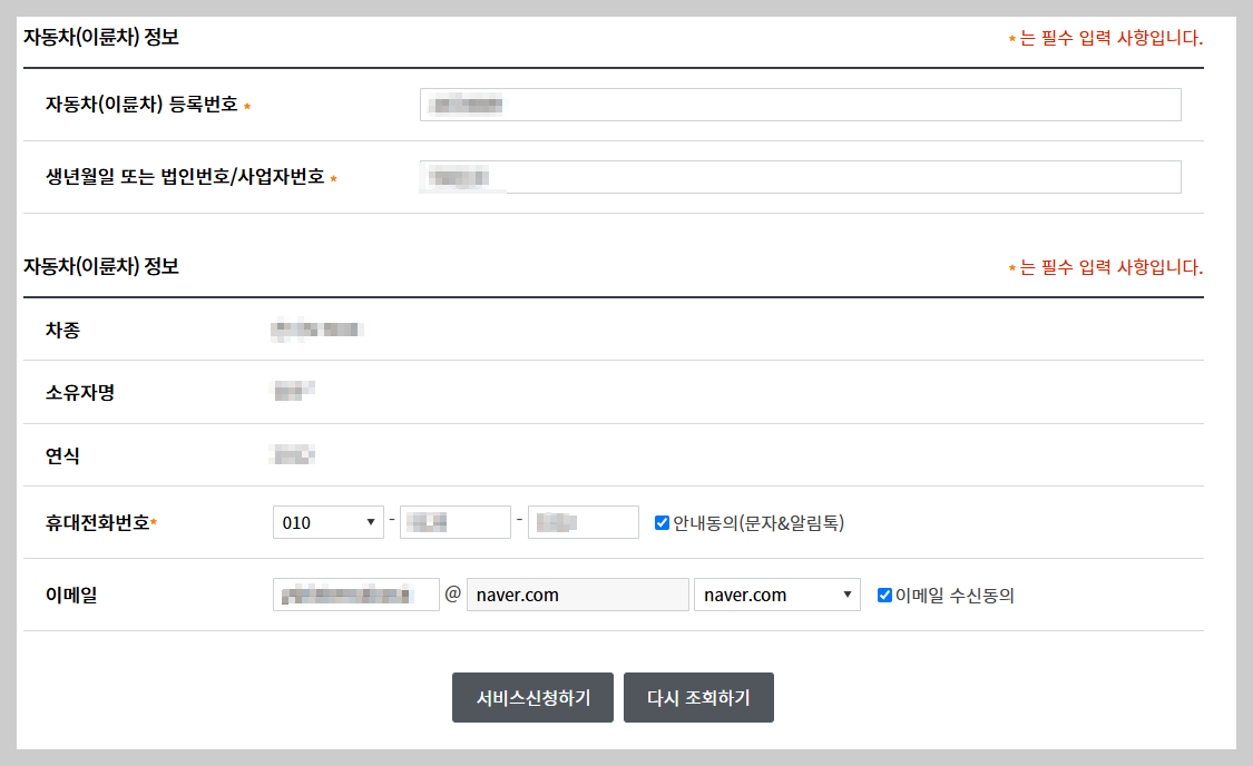 자동차 등록번호와 생년월일 6자리를 입력하면 차량 정보가 나옵니다. 휴대 전화번호와 이메일을 입력하고 서비스 신청하기를 눌러 신청을 완료합니다.