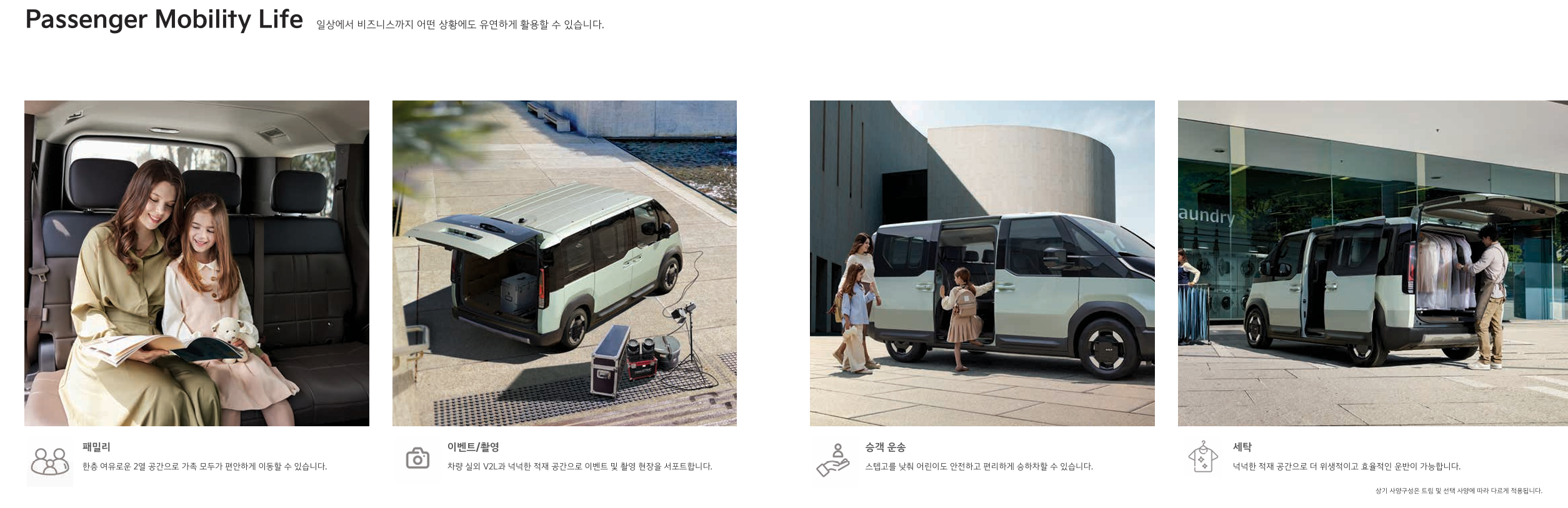 - 다양한 모듈: 기본형 밴, 하이루프, 픽업, 로봇 택시 등 다양한 형태로 변환 가능해요. 개인의 라이프스타일에 따라 정말 무궁무진하게 활용될 수 있다는 점이 가장 매력적이죠.